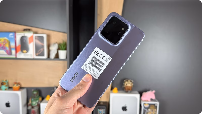 هم اکنون توصیه میکنیم گوشی پوکو سی 85 را به گونهای در دستان خود بگیرید که امکان مشاهده بخش عقب آن فراهم باشد. شما در گوشه سمت چپ قسمت بالای بدنه بخش عقب، ماژول دوربین مستطیل شکل را مشاهده خواهید کرد که درون آن، سنسورهای دوربین و فلاش ال ای دی قرار گرفتهاند. همچنین شما شاهد درج عبارت POCO خواهید بود که به صورت عمودی در سمت چپ بخش عقب درج شده است؛ این نام نشاندهنده اصالت دستگاه است.