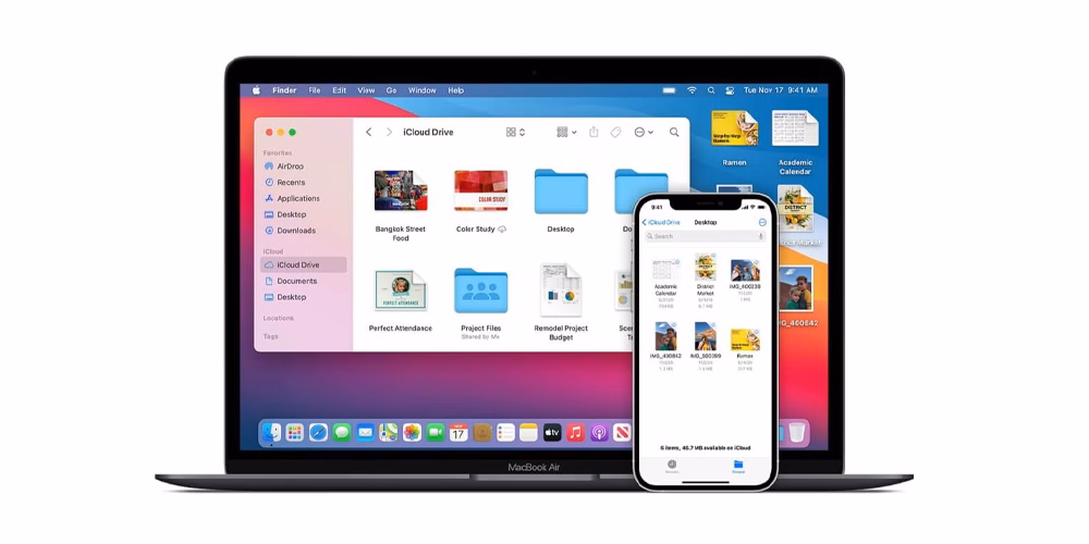 برای اسناد، فایلهای PDF و سایر فرمتها، آیکلاد درایو نقش یک فلش مموری مجازی را بازی میکند. کافی است در آیفون فایل خود را در برنامه Files و در پوشه iCloud Drive ذخیره کنید. چند لحظه بعد، آن فایل در پوشه iCloud Drive در فایندر مکبوک در دسترس خواهد بود.